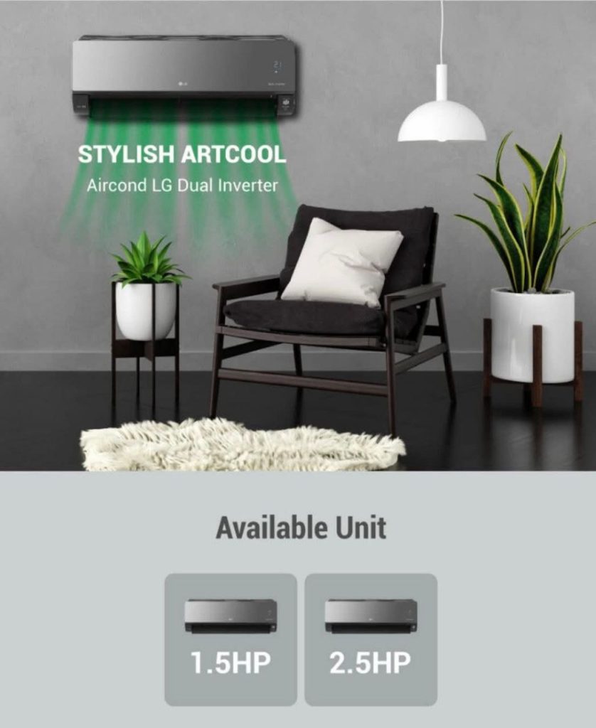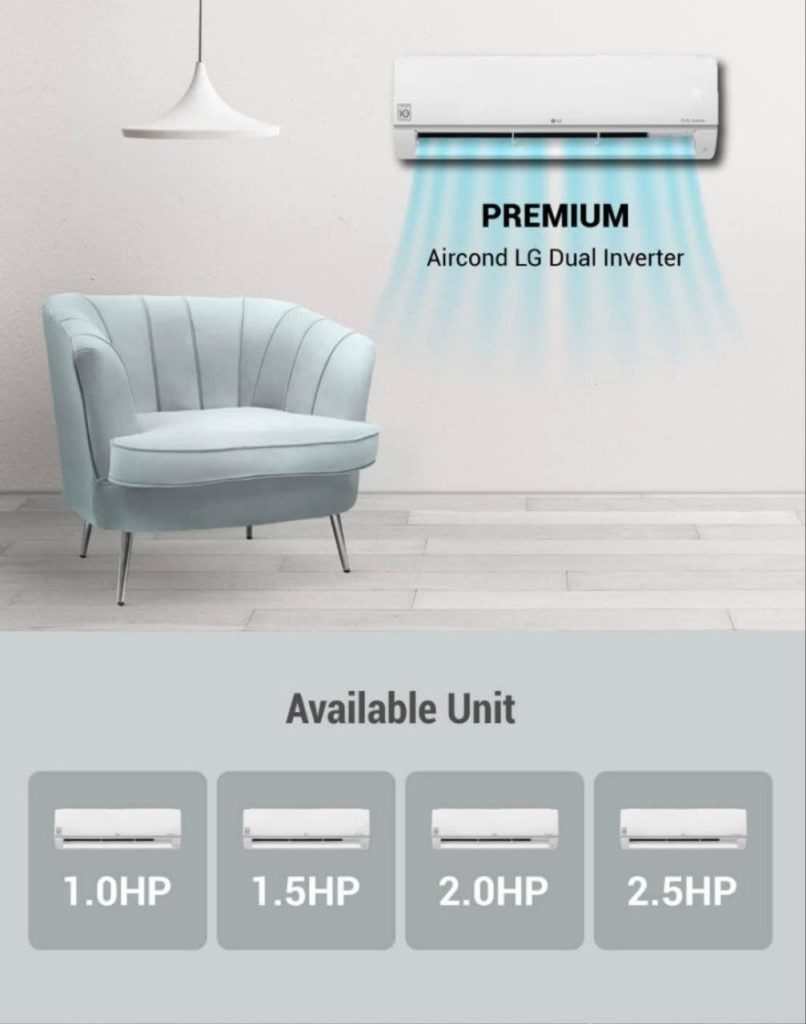 Perkenalkan solusi untuk anda Aircond berjenama LG terbaru. Mempunyai 4 jenis hose power mengikut keluasan rumah dan bilik iaitu 1.0hp, 1.5hp, 2.0hp dan 2.5hp.