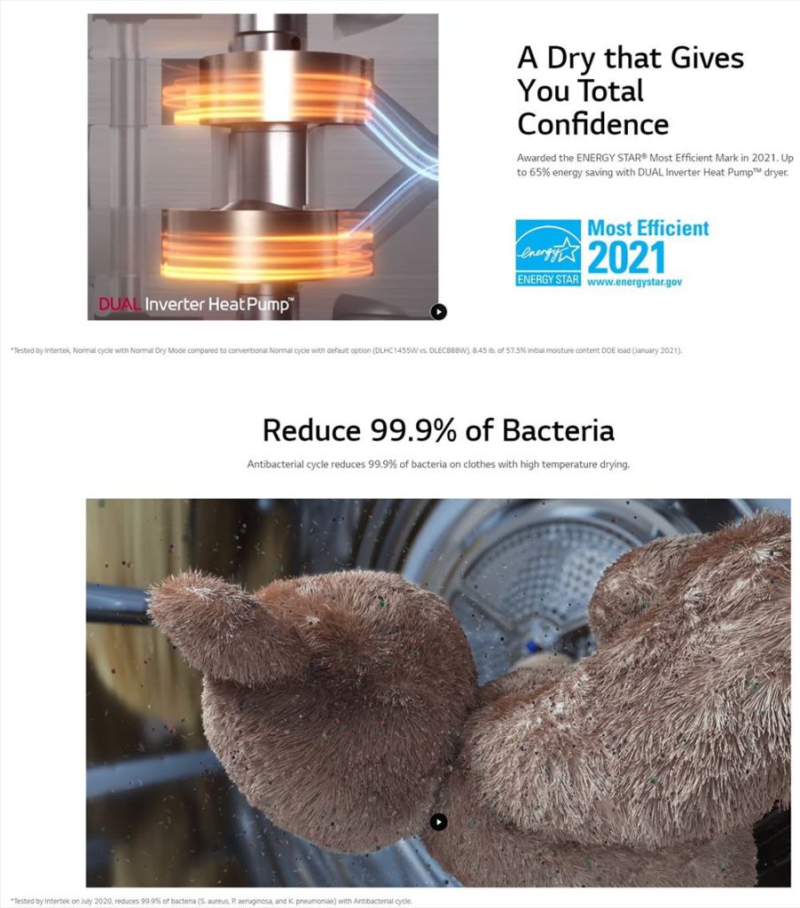 Sistem LG Dryer Dual Inverter Heatpump menggunakan teknologi Heat Pump dan Inverter Compressor untuk mengeringkan pakaian dengan lebih efisien, jimat tenaga, dan kurang panas berbanding dryer biasa.